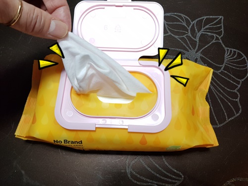 물티슈를 뽑아 쓰다 보면 한 장이 아닌 여러장이 뭉태기로 나오는 경우가 있었을겁니다. 그런 부분도 간단히 해결할 수 있는데요. 가위로 양옆을 잘라주면 물티슈를 뽑을때 한 장씩 나와서 알뜰하게 사용할 수 있습니다.