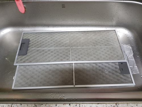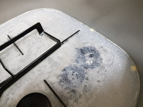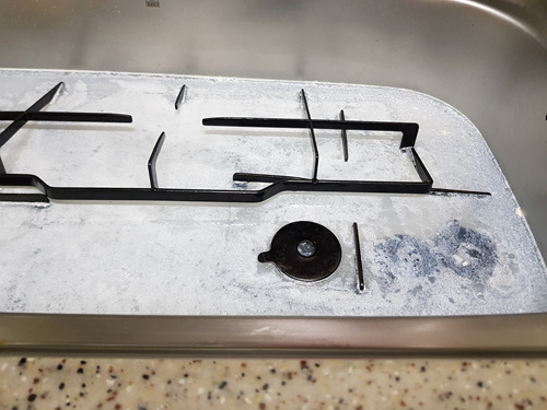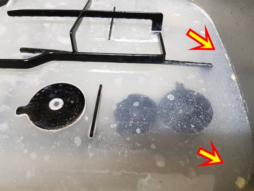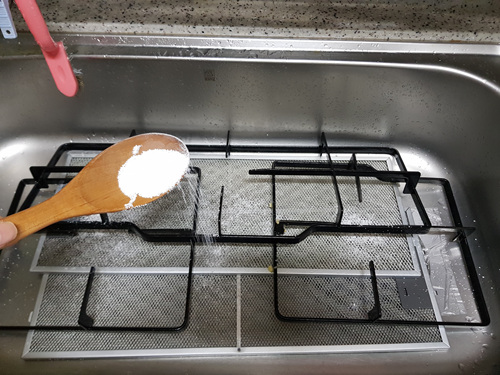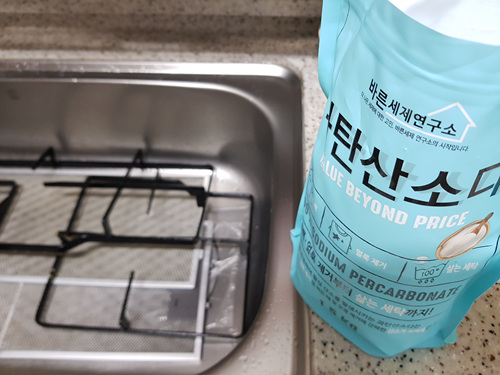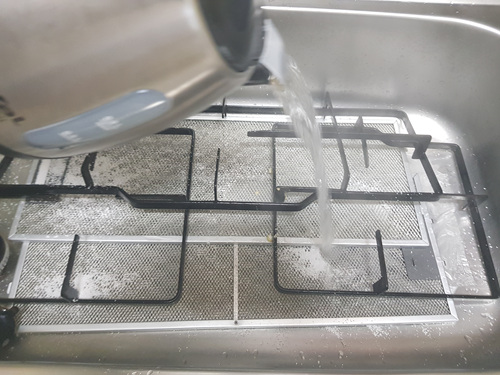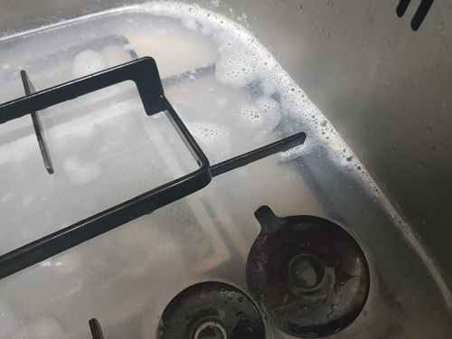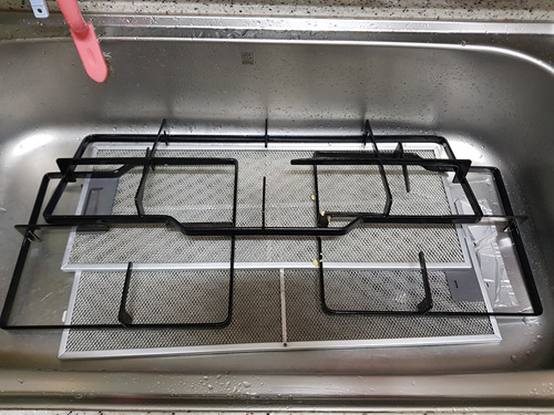 후드 안쪽을 청소하는 동안 물에 담궈 놓은 후드와 삼발이 그리고 가스렌지 부속들의 때가 둥둥 뜹니다. 그렇게 되면 기름때를 힘들이지 않고 청소가 가능해요.
