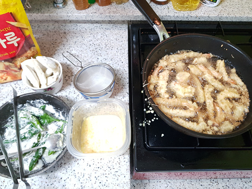 외식이 줄어 드니 평소 제일 먹고 싶었던 음식을 매일 한가지는 해 먹는 것 같습니다. 떡볶이를 포장해 와 평소 먹고 싶었던 새우, 고추튀김을 해서 같이 먹었어요.. 역시 바로 해 먹어야 튀김은 더 맛있는 것 같아요.. 조금 번거롭게 느껴질지 모르지만 그래도 먹고 싶은거 맘대로 해 먹으니 이또한 즐거움이네요.
