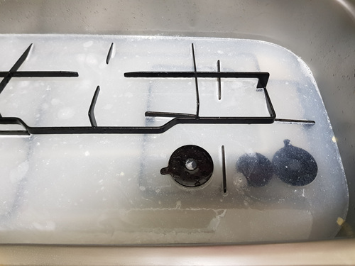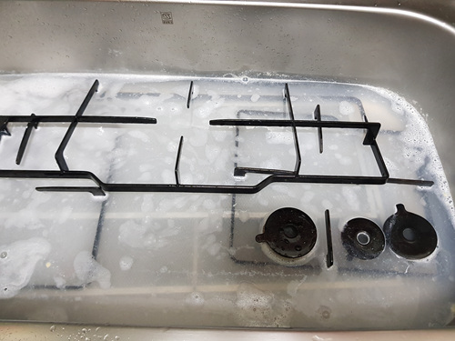 후드 안쪽을 청소하는 동안 물에 담궈 놓은 후드와 삼발이 그리고 가스렌지 부속들의 때가 둥둥 뜹니다. 그렇게 되면 기름때를 힘들이지 않고 청소가 가능해요.