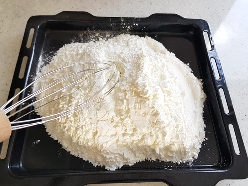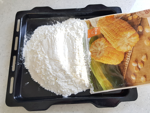 그다음 옥수수전분을 넓는 판에 펼쳐 놓습니다.