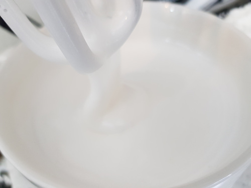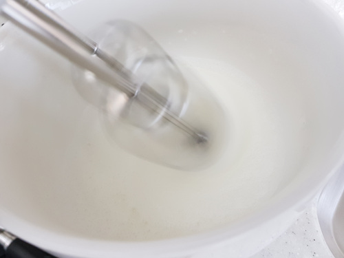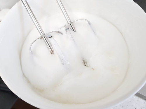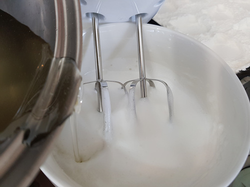 머랭을 치면서 만든 시럽을 조금씩 넣으면서 계속 머랭을 치세요.