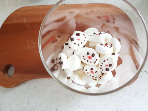 마쉬멜로우는 너무 크면 핫초코 위에 올릴 경우 가라 앉아서 작게 잘라서 올려야 해요. 저도 한입에 딱 먹기 좋게 가위로 잘랐어요. 그리고 이쁘게 데코를 해 주기로 했지요.
