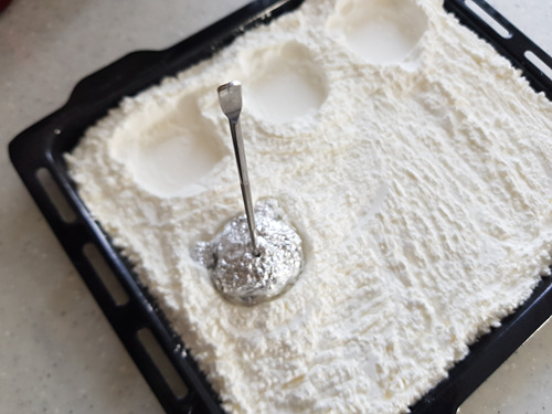 평평하게 펼친 옥수수전분 위에 모양을 만들어 놓은 것을 살짝 눌러 찍습니다. 이때 손으로 꾹꾹 누르니 전분도 많이 묻고 호일을 찍어 올리는데 자꾸 미끄러져 뭔가가 필요함을 느끼게 되었지요.
