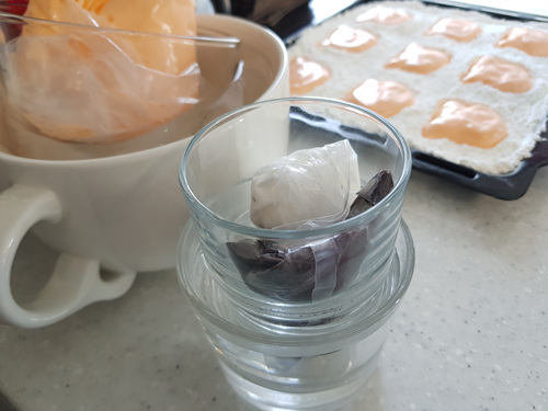 젤라틴이 들어가 있기 때문에 실온에서는 잘 굳습니다. 그렇기때문에 중탕을 수시로 해 줘야 해요. 이게 제일 힘들었던 거 같아요..