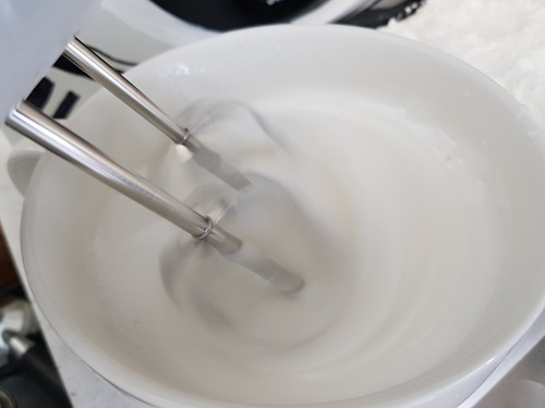 머랭을 치면서 만든 시럽을 조금씩 넣으면서 계속 머랭을 치세요.