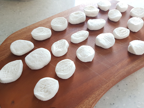 마지막으로 마쉬멜로우가 굳으면 옥수수전분을 골고루 묻혀 준 후 하나씩 꺼내면 됩니다.