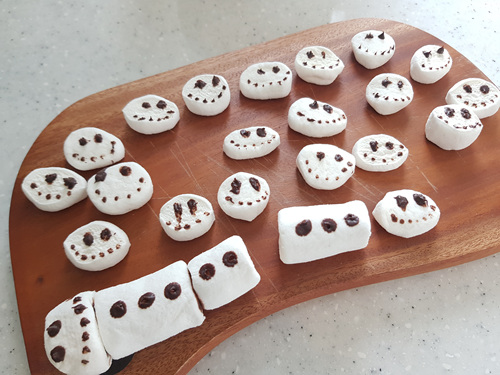 마쉬멜로우는 너무 크면 핫초코 위에 올릴 경우 가라 앉아서 작게 잘라서 올려야 해요. 저도 한입에 딱 먹기 좋게 가위로 잘랐어요. 그리고 이쁘게 데코를 해 주기로 했지요.