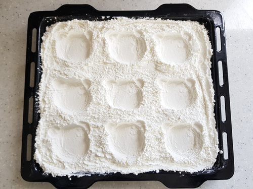 옥수수전분에 모양을 만들어 놓은 곳에 조심스럽게 넣어 주세요.