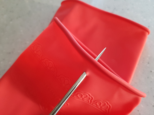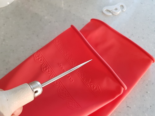 송곳으로 고무장갑 윗 부분에 구멍을 뚫은 뒤....