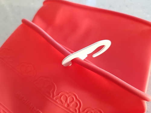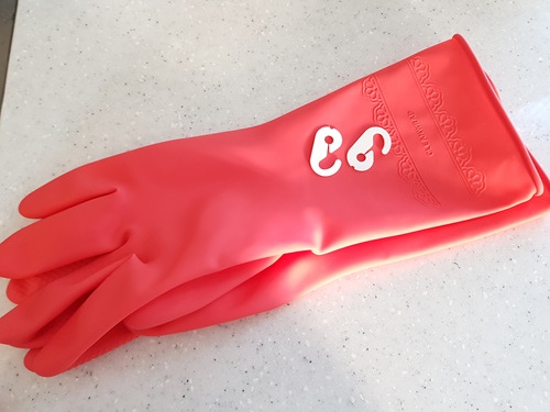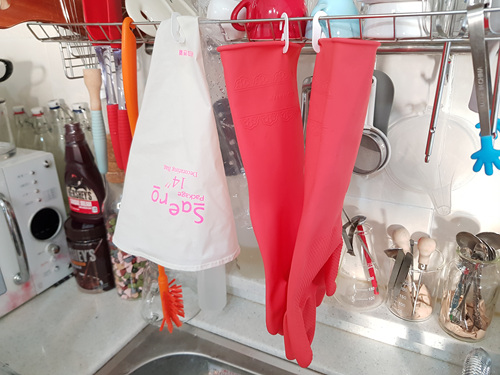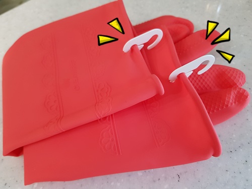 이렇게 끼운 마스크 연결고리는 설거지 후 걸어 두면 고무장갑에 물빠짐도 좋고 위생적으로 사용 가능해요. 물론 안쪽 바깥쪽 뒤집어 걸어도 되니 고무장갑 소독 후 걸어 두기도 완전 좋습니다.