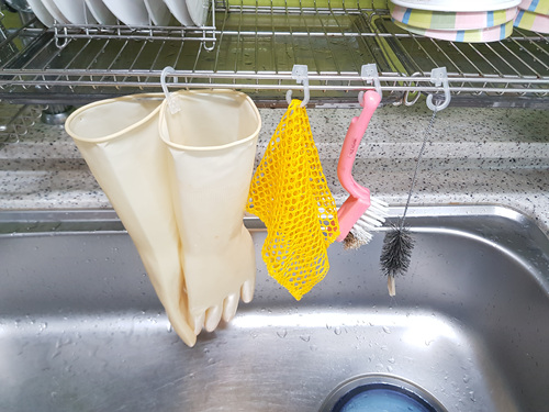 물론 고무장갑은 높낮이가 가능하기에 윗 부분 싱크대 선반에 따로 걸어둬도 됩니다.