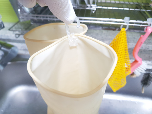 속옷 고리 하나를 꽂아서 사용하면 됩니다. 물론 고무장갑을 사용할때는 분리하고 고무장갑을 사용하지 않을때는 다시 고리를 꽂아서 걸어두면 됩니다. 너무 유용하게 사용되죠~