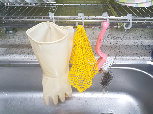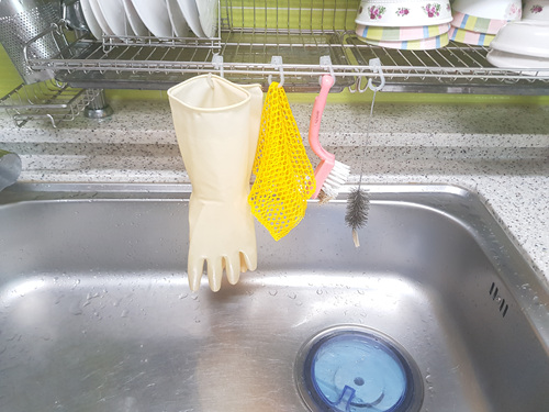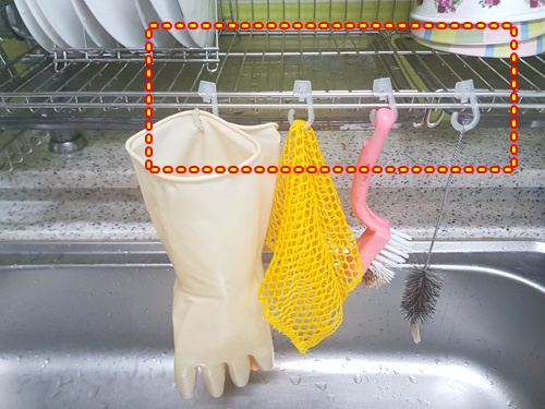 물론 고무장갑은 높낮이가 가능하기에 윗 부분 싱크대 선반에 따로 걸어둬도 됩니다.