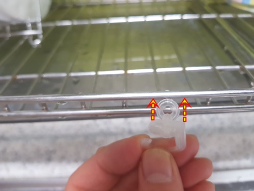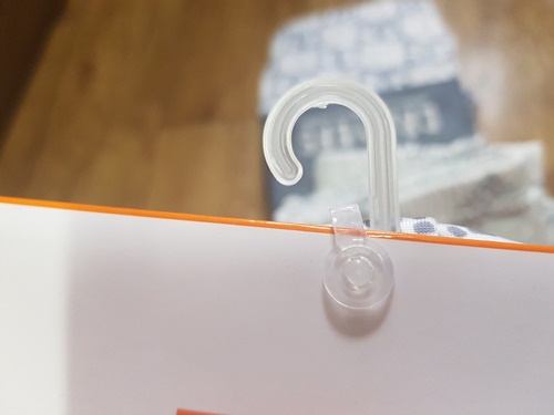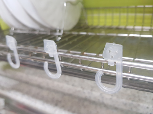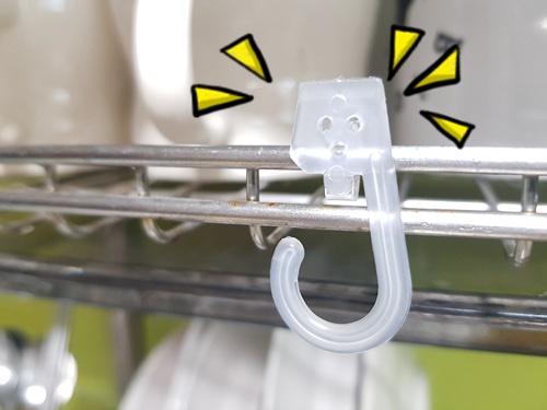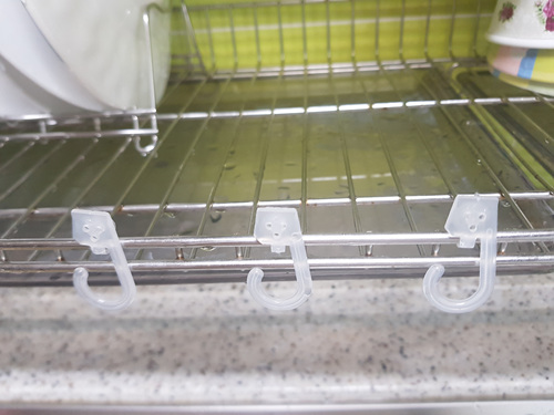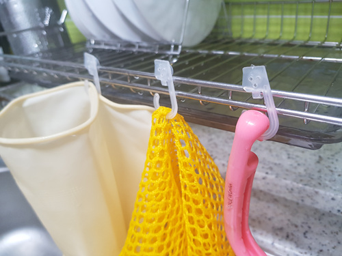 속옷 고리 하나를 꽂아서 사용하면 됩니다. 물론 고무장갑을 사용할때는 분리하고 고무장갑을 사용하지 않을때는 다시 고리를 꽂아서 걸어두면 됩니다. 너무 유용하게 사용되죠~