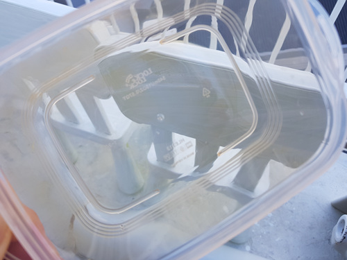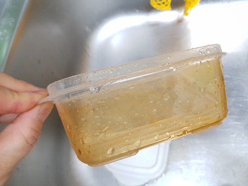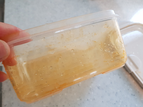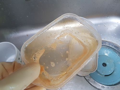 주방세제로 열심히 닦았지만 김치국물이 들어 버린 플라스틱입니다.