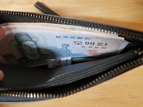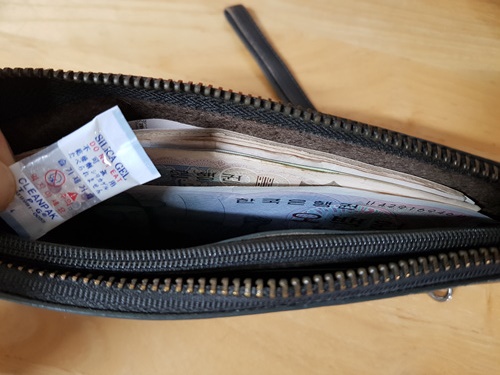 전 오래된 지폐를 넣어 두는 가죽지갑에 실리카겔을 넣어 뒀어요.