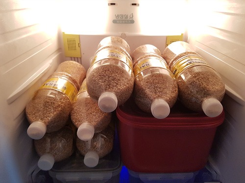 잘 담아 놓은 쌀은 온도 유지가 잘 되는 냉장고에 보관 두고 먹을거예요. 현미 위주의 식단이라 20kg 빨리 먹는답니다. 자취생이나 시골에서 쌀을 받아 오는 분들은 이렇게 보관하면 오래도록 벌레가 생기지 않고 드실수 있습니다. 만약 페트병이 없다면 지퍼백에 소분해 보관하면 됩니다. ^^