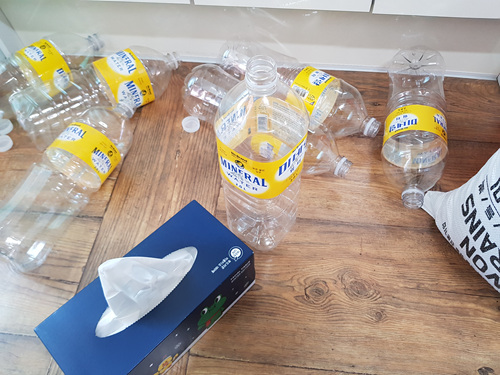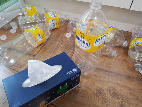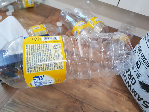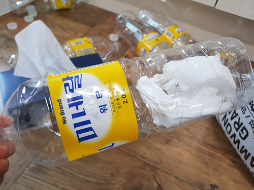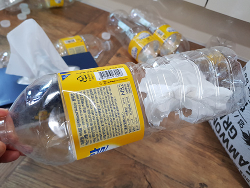 페트병은 생수를 먹은 통으로 이용하고요. 물론 물로 한 번더 세척해 재활용 합니다. 그런데 페트병을 하루종일 거꾸로 해 놓아도 물기가 완벽하게 제거하기가 쉽지 않지요. 그래서 전 키친타올이나 티슈를 이용해요.