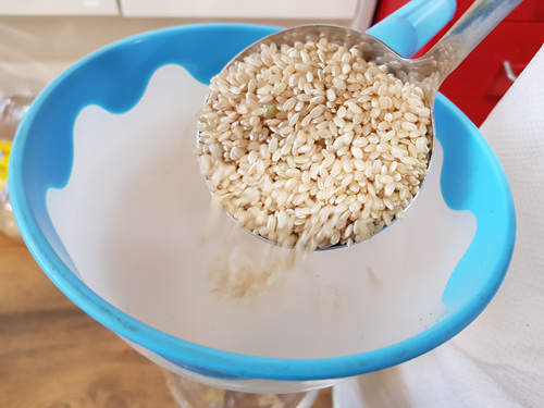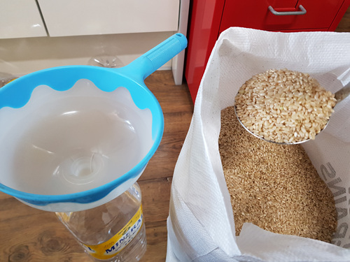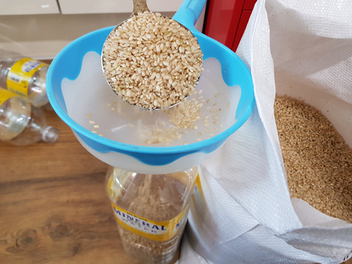 페트병에 물기도 잘 제거했으니 이젠 현미를 담아 줄거예요. 페트병에 옮겨 담을때는 깔대기를 이용하면 수월해요.