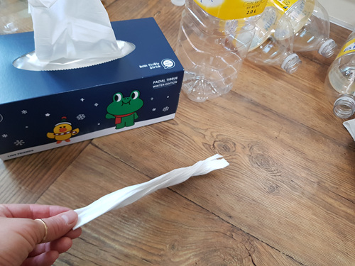 티슈를 돌돌 말아 페트병 안에 넣어 닦는데요. 티슈는 길이가 짧아 2개를 돌돌 말아 연결해 닦았어요.