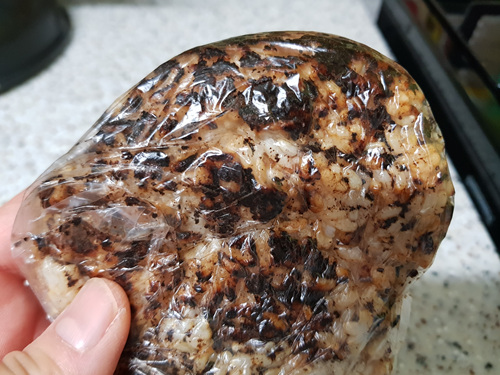 약불에서 앞 뒤로 뒤집어 가며 구워지고 있는 현미밥...