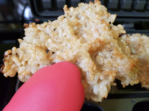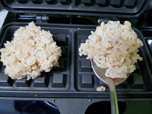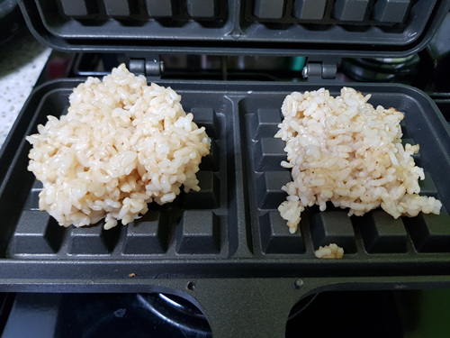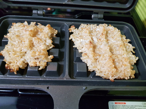 와플팬에 빵 굽듯이 약한 불에 구우면 현미밥도 누룽지가 되지 않을까? 하는 생각에 시도를 해 봤어요. 타지 않은 현미밥을 덜어서 와플팬에 올린 뒤 구워 보기로 했습니다.