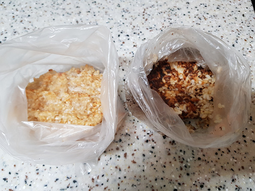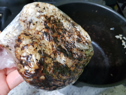 와플팬에 누룽지를 만들 동안 압력밥솥에 있던 새까맣게 탄 누룽지를 1회용 비닐봉지에 담았어요. 나중에 팍팍 끓여 먹으려고... ㅜㅜ