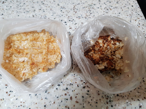 왼쪽에 황금빛으로 구워진 누룽지는 와플팬에 구운거구요...오른쪽은 압력밥솥에 밥하면서 만드려다 실패한 누룽지입니다.