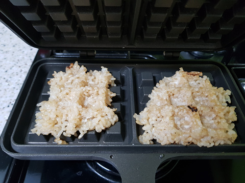 와플팬에 빵 굽듯이 약한 불에 구우면 현미밥도 누룽지가 되지 않을까? 하는 생각에 시도를 해 봤어요. 타지 않은 현미밥을 덜어서 와플팬에 올린 뒤 구워 보기로 했습니다.