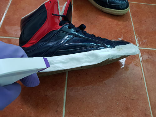 치약으로 신발밑창을 닦은 것과 안 닦은 것을 비교해 보니 차이가 확실히 납니다.