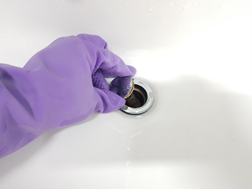 머리카락을 한 움큼 꺼내고 난 뒤 세면대 물구멍 속을 칫솔을 이용해 깨끗이 닦았습니다.