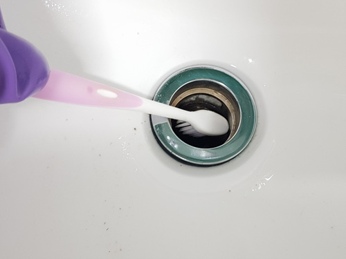 머리카락을 한 움큼 꺼내고 난 뒤 세면대 물구멍 속을 칫솔을 이용해 깨끗이 닦았습니다.