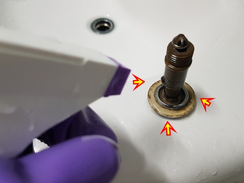 세면대 물마개를 뒤집으니 곰팡이가 끼어 이곳은 락스를 이용해 닦았네요..