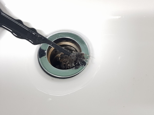 세면대에 물이 잘 내려가지 않았던 이유는 바로 머리카락 때문이었습니다. 고무장갑을 착용해서 손으로 꺼내려 잘 안돼서 빗 뒷면을 이용해서 막혀 있던 머리카락을 꺼냈습니다.