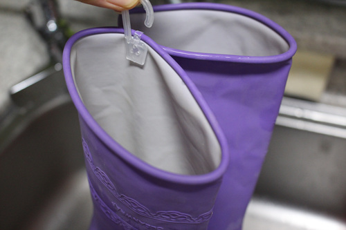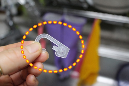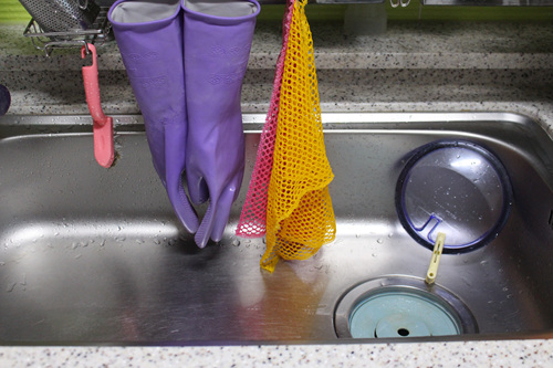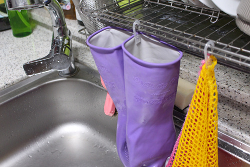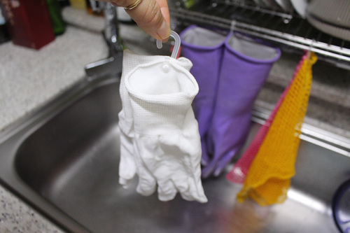 설거지 후 고무장갑 물기도 빼고 고무장갑 속 공기도 솔솔 통하게 고리를 꽂아 걸어 둡니다. 이 고리는 속옷에 달린 고리입니다. 양말에도 달린 고리니 이제 버리지 말고 이런 곳에 활용해 보세요.
