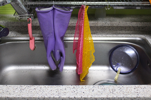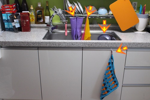 설거지 후 고무장갑 물기도 빼고 고무장갑 속 공기도 솔솔 통하게 고리를 꽂아 걸어 둡니다. 이 고리는 속옷에 달린 고리입니다. 양말에도 달린 고리니 이제 버리지 말고 이런 곳에 활용해 보세요.