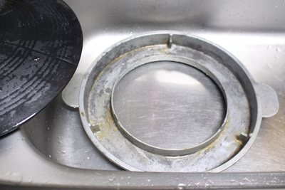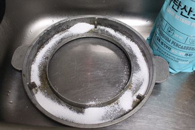 솥뚜껑 아래 물받이는 더 깔끔하게 씻어야 했어요. 수세미로 박박 문지르는 것은 기본이고 과탄산소다를 넣어 살균소독까지 했네요.
