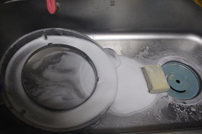 물을 붓자마자 뜨거운 물과 만난 과탄산소다는 거품을 내며 넘쳐 흘러요. 이때 싱크대 개수대 주변과 개수대통 속 청소도 자연스럽게 됩니다. 물론 솥뚜껑 물받이도 깨끗이 세척이 됩니다.