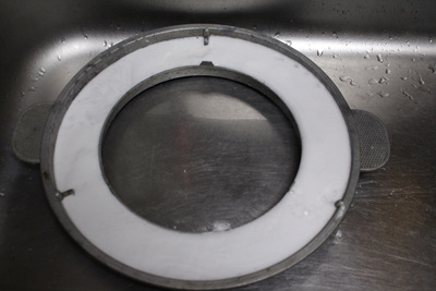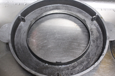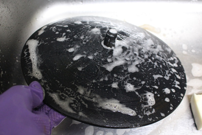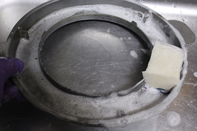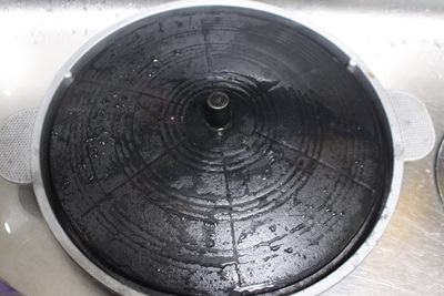 솥뚜껑 아래 물받이는 더 깔끔하게 씻어야 했어요. 수세미로 박박 문지르는 것은 기본이고 과탄산소다를 넣어 살균소독까지 했네요.