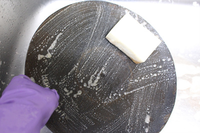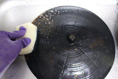 그리고 녹이 슨 솥뚜껑은 수세미로 박박 문지러 녹을 제거했습니다.