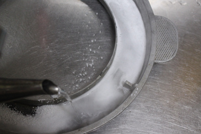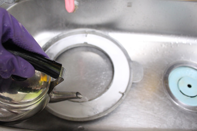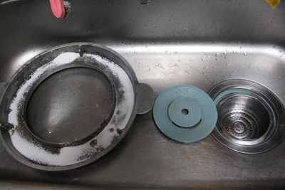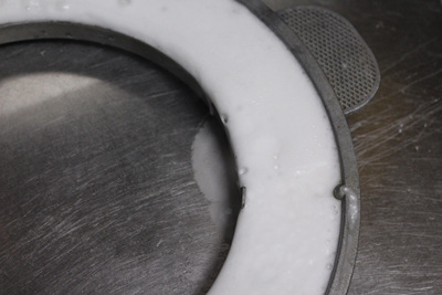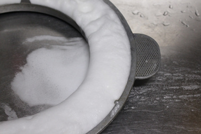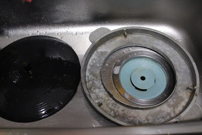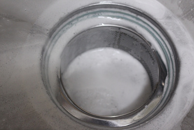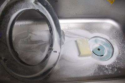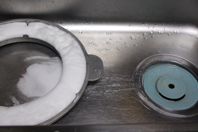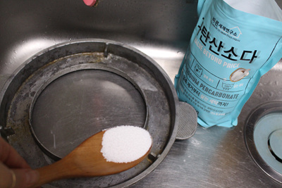 물을 붓자마자 뜨거운 물과 만난 과탄산소다는 거품을 내며 넘쳐 흘러요. 이때 싱크대 개수대 주변과 개수대통 속 청소도 자연스럽게 됩니다. 물론 솥뚜껑 물받이도 깨끗이 세척이 됩니다.