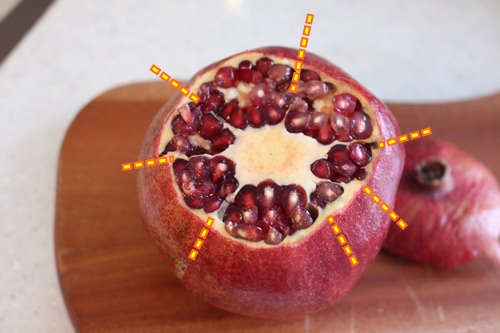 윗부분을 자르면 이런 모습이 되는데요... 위에서 석류 단면을 보면 별 모양으로 흰부분이 있는데 그 부분을 공략해 칼집을 내어 주세요.