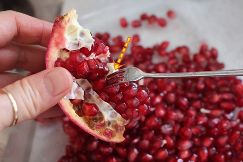 포크를 이용해 긁어 내는 방법이 있어요.. 전 포크를 이용하니 더 꼼꼼하게 석류알을 분리할 수 있어 좋았어요. 물론 손에 석류알을 묻히지 않고 분리할 수 있었어요.