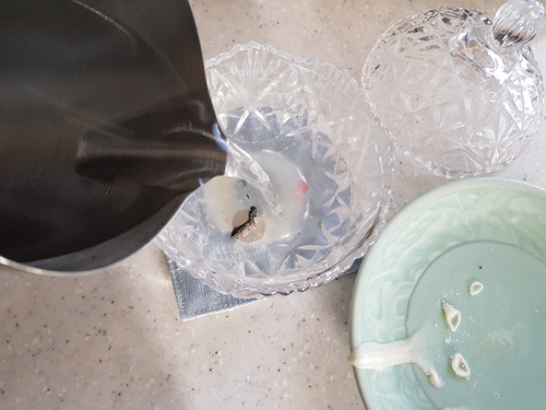 먼저 준비할 것이 있는데요.. 뜨거운 물과 티슈입니다. 뜨거운 물을 유리케이스에 부어 주는데요. 이때 너무 팔팔 끓는 물이 아닌 조금 식혀서 부어 주거나 쇠젓가락을 케이스에 넣은 뒤 젓가락에 물이 닿이도록 부어 주세요. 그럼 케이스가 깨질 염려는 하지 않으셔도 됩니다.