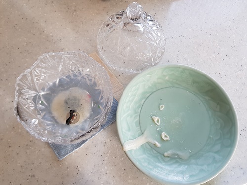 깨끗이 씻은 유리케이스와 접시입니다. 정말 깔끔하게 촛농이 없어졌죠.