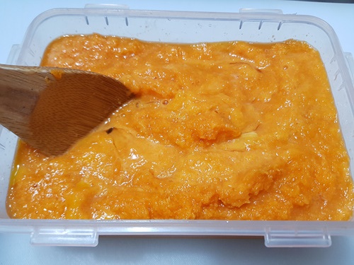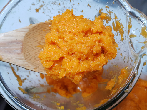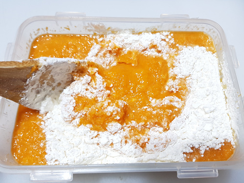 늙은호박을 어떻게 먹을까? 생각하다 평소 우리가 잘 먹는 것을 요리해 먹기로 했죠.. 일단 호박을 잘라서 씨를 제거하고 조각을 내어 소분포장을 한 뒤 냉동실에 보관했습니다. 그리고 먹기 직 전 꺼내 해동한 다음 믹서기에 갈아 전을 부쳐 먹기로 했지요.