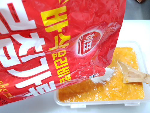호박전 반죽을 할때 농도는 조금 뻑뻑할 정도로 부침가루를 섞어주면 됩니다. 여기서 키포인트로 호박전을 얇고 바삭하게 구워야 제맛이잖아요. 그러긴 위해선 반죽을 한 뒤 냉장고에 넣어 30분 후 구워 드시면 더 바삭하게 구어 드실 수 있습니다.