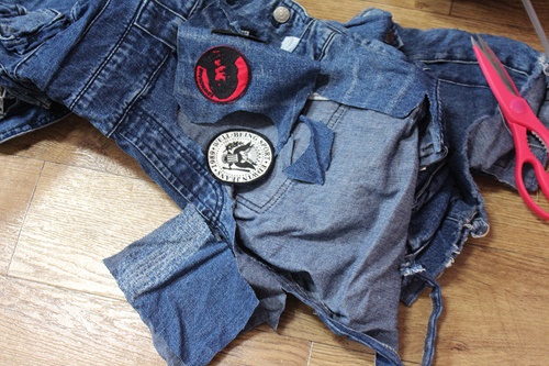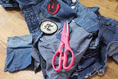 먼저 티매트 만들 청바지를 네모나게 자르고 청바지에 붙어 있는 나름 버리기 아쉬운 것들도 오려 냈습니다.