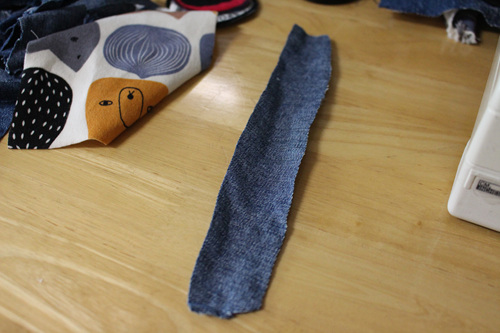 요렇게.. 안쪽으로 두 번 접어서 박음질을 하니 하나의 끈이 완성되었습니다. 청바지라 다림질 할 필요도 없고 편하더군요.
